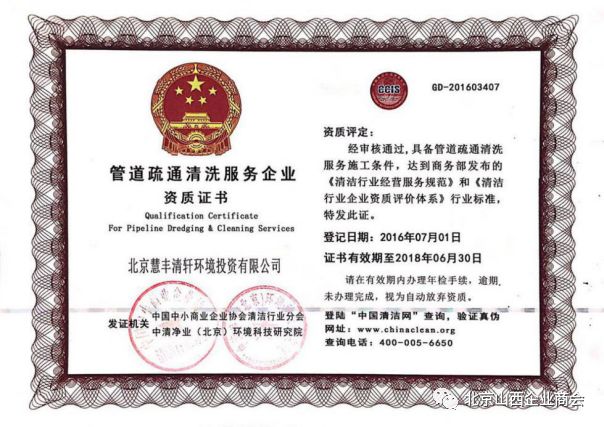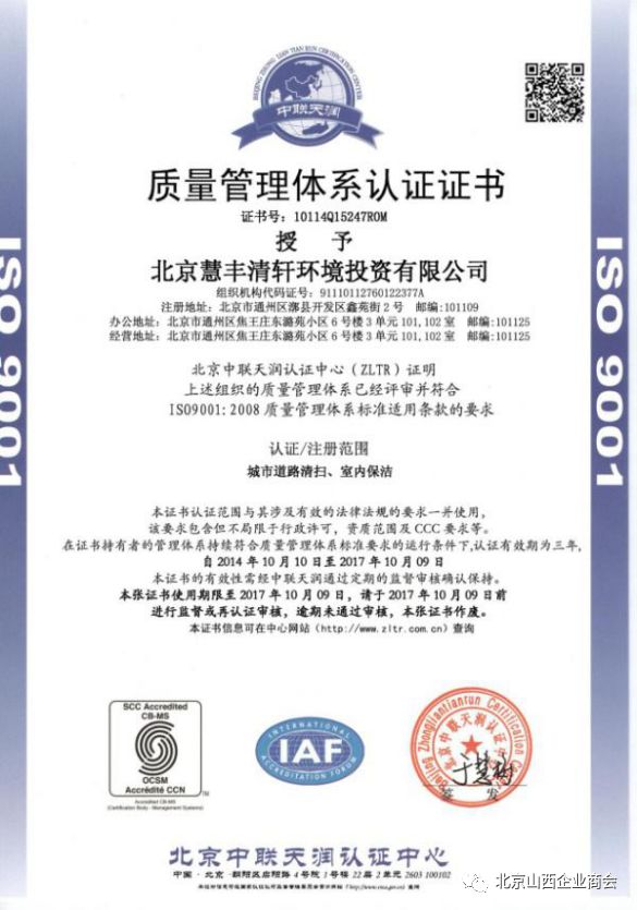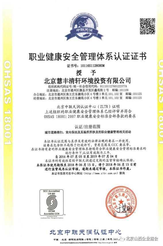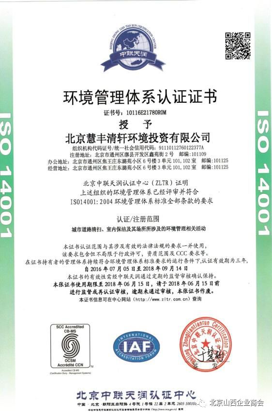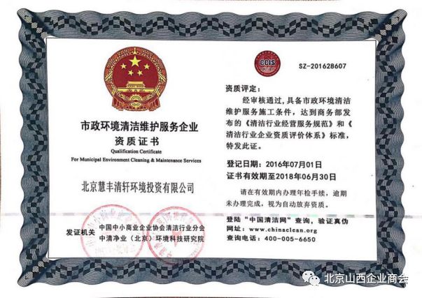 “慧丰清轩”于2015年通过了ISO9001:2008企业质量管理体系认证、ISO14001:2004环境管理体系认证、OHSAS18001:2007职业健康安全体系认证,获得北京市和北京市通州区市政市容管理委员会关于城市生活垃圾清扫、收集、运输服务的行政许可。集团现有各种作业车辆1000余辆,符合环卫市场机械设备的投入需求。还与与中联重科等企业建立了长期战略合作伙伴关系,能够保证各种车辆及设备的及时供应。