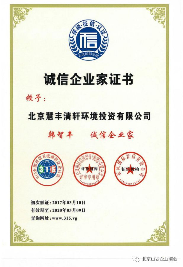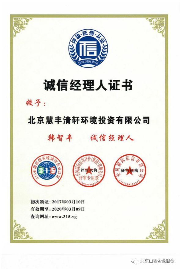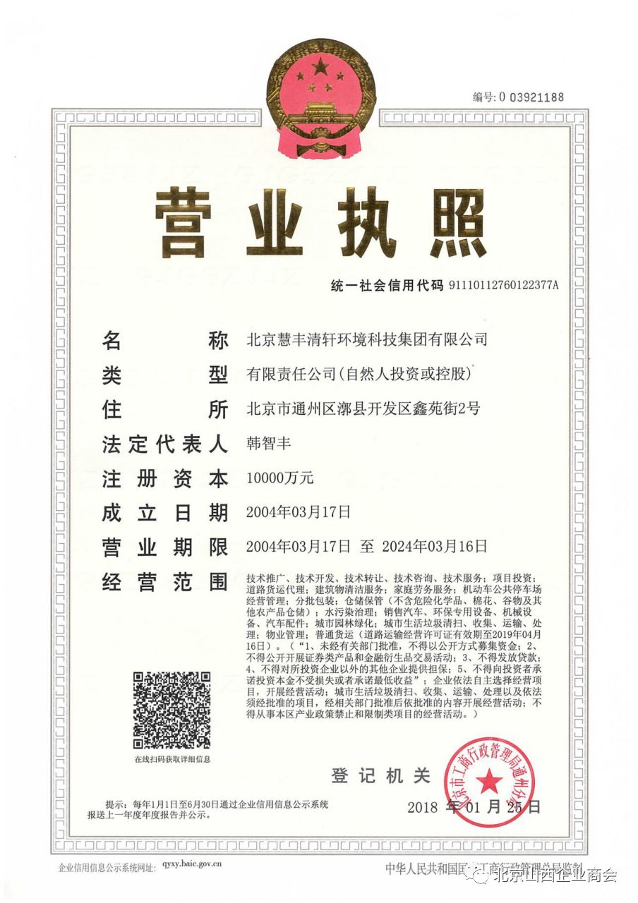 欢迎《北京慧丰清轩环境科技集团有限公司》副总李会建,成为:商会理事单位,祖籍:山西洪洞,公司经营范围包括:城市园林绿化;城市生活垃圾清扫、收集、运输、处理,垃圾场运营;垃圾焚烧;畜禽粪便处理;秸秆堆肥;餐厨垃圾处理;水污染治理;物业管理;技术推广、技术开发、技术转让、技术咨询、技术服务;项目投资;垃圾中转站建设;垃圾填埋场建设;建筑物清洁服务;家庭劳务服务等业务。