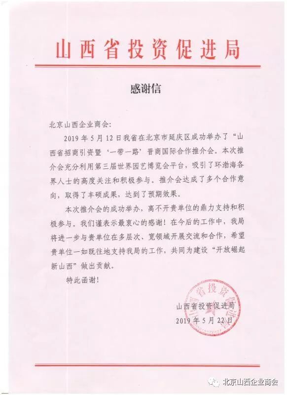 5月12日,山西省招商引资暨“一带一路”晋商国际合作推介会在北京延庆成功举办,活动由山西省人民政府主办,山西省商务厅、山西省投资促进局承办,我商会在此次大会的场地选择、舞台搭建、会议组织等方面给予了全力支持和协助,组织参会人员达30多人,受到山西省领导和组织会议单位高度赞扬,投资促进局特发来感谢信,对商会的鼎力支持和积极参与表示感谢。商会将在多层次、多领域为家乡招商引资进行卓有成效的精准对接,为山西经济发展做出卓越贡献。
