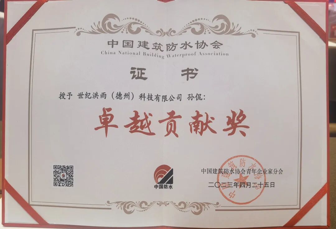 世纪洪雨(德州)科技有限公司当选中国建筑防水协会青年企业家分会“2021-2022年度先进会员企业”。